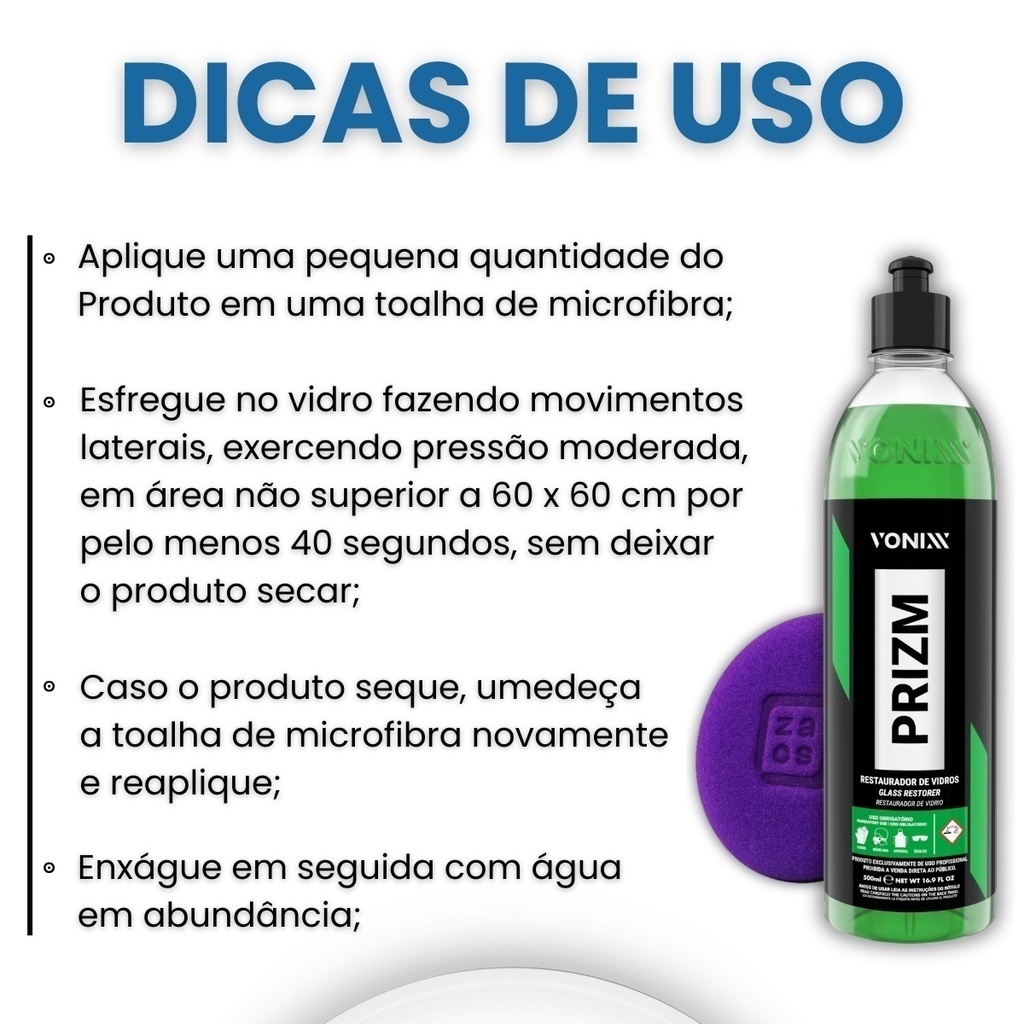 Prizm 500ml vonixx, remove impurezas impregnadas como chuva ácida, oleosidade, poluição e outras contaminações que os limpadores comuns não conseguem tirar. Ideal para restaurar a transparência e melhorar a visibilidade, sem agredir o vidro.